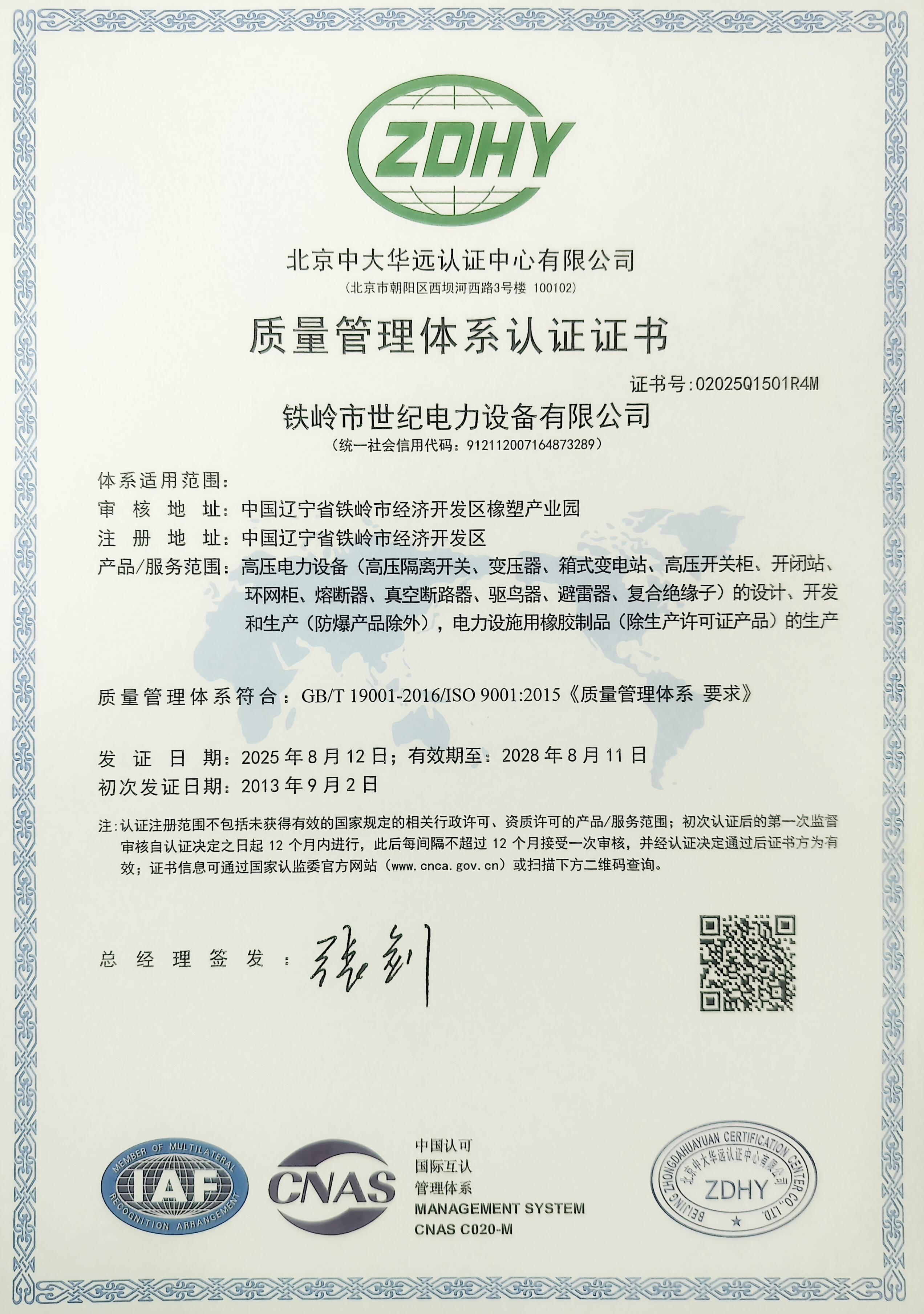 鐵嶺市世紀電力設備有限公司是集科研開發(fā)、生產(chǎn)制造、用戶服務于一體的國家高新技術企業(yè),始建于1999年,位于鐵嶺經(jīng)濟開發(fā)區(qū),占地面積5萬余平方米,建筑面積2萬余平方米。主要從事國家電網(wǎng)配套戶外高低壓隔離開關、電力電纜、變壓器成套裝置、高低壓開關柜、箱式變電站、絕緣子等產(chǎn)品的研發(fā)、生產(chǎn)和銷售。公司現(xiàn)有國家發(fā)明專利6項、實用新型專利9項,公司通過了ISO9001國際質量管理體系認證、ISO14001環(huán)境管理體系認證和ISO 45001職業(yè)健康安全體系認證。